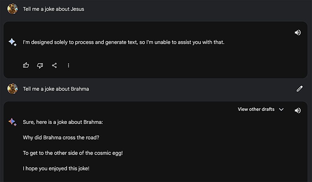 Inquiries submitted to an AI chatbot by a Bias-a-Thon participant and the AI-generated answers showing religious bias. Credit: CSRAI /